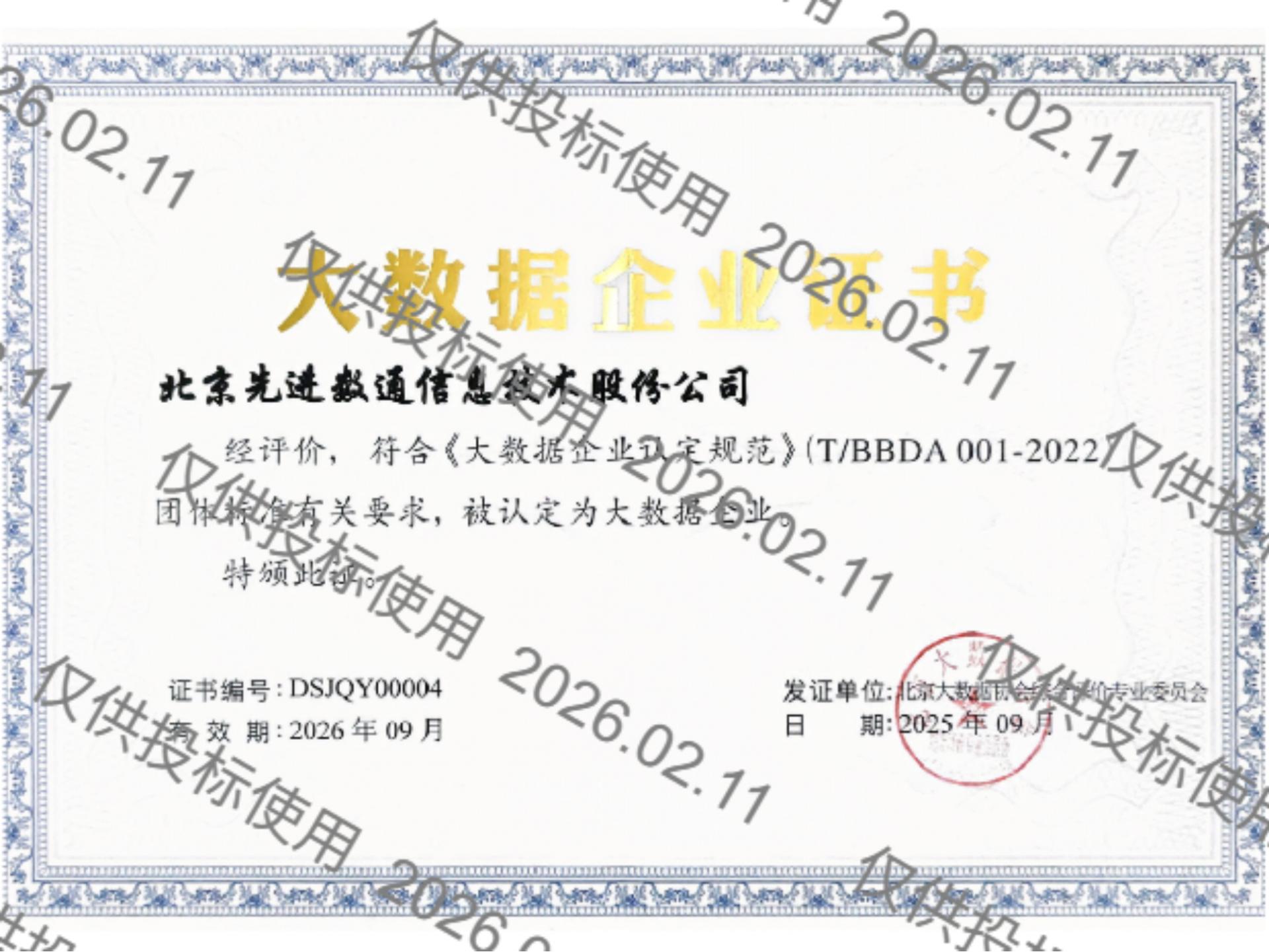 • 大数据企业证书
