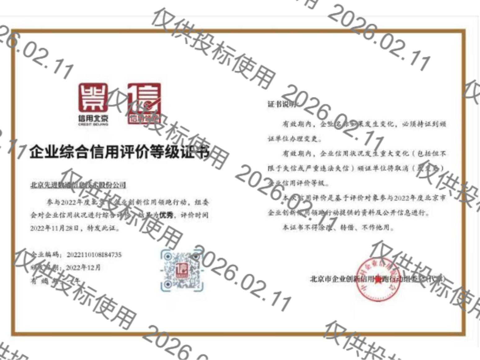 • 企业综合信用评价品级优异的证书